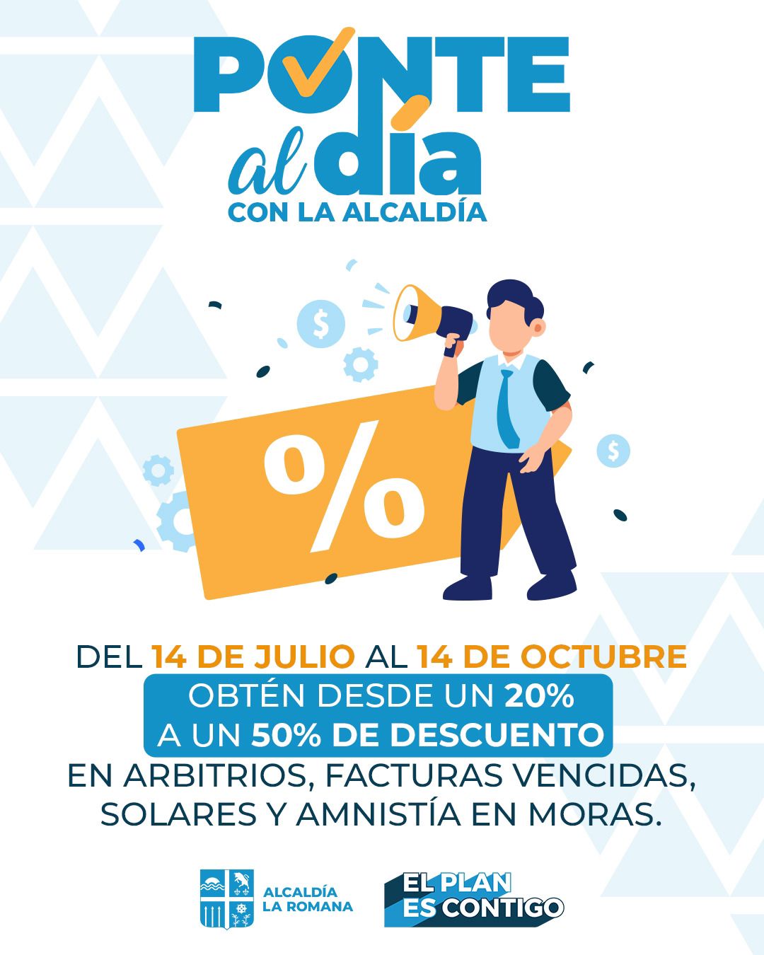 Del 14 de julio al 14 de octubre, con “Ponte Al Día con la Alcaldía, la ciudadanía podrá obtener de un 20 a un 50 % de descuento en arbitrios, facturas vencidas, solares y amnistía en moras en los departamentos de rentas municipales, catastro y residuos sólidos.